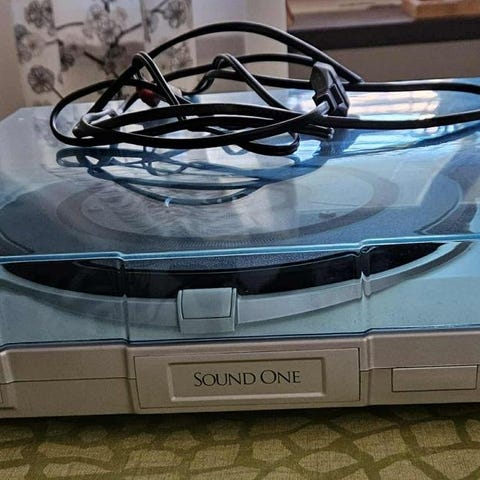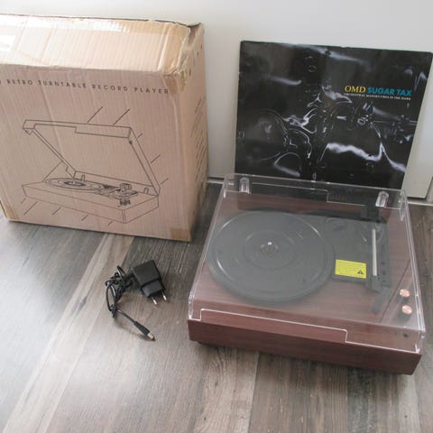Dual 1229 skivspelare med inbyggd radio och förstärkare. Utrustad med tonarm och rattar för olika inställningar. Har en skyddande plastlock och tillhörande kablar för anslutning.