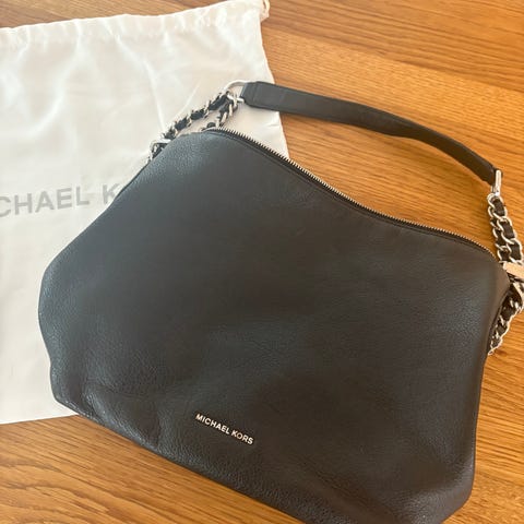 Äkta Michael Kors läderväska i svart pebble leather med silverdetaljer. Använd bara ett fåtal gånger och i mycket gott skick. Mindre kosmetiska märken på dragkedjan och något slitage på metall underifrån, syns knappt. Rymligt fack med dragkedja och stadiga axelremmar. Medföljer care-card.