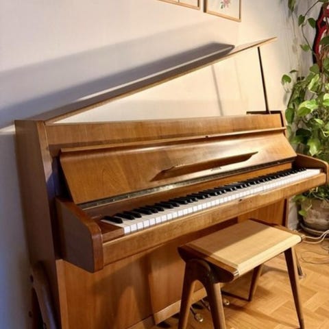 Piano i gott skick, komplett tangentbord och pedaler. I behov av att stämmas och med en skada på översidan (se bild). Passar för musikövning och spel i hemmet eller andra miljöer där ett kompakt piano önskas.