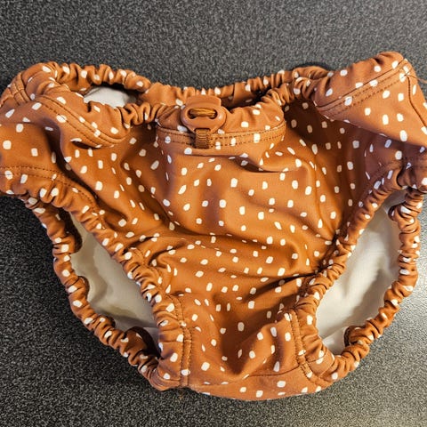 Badbyxor med delfin är från Mini Rodini och är i storlek 80/86. Inköpt av oss och använt till ett barn.