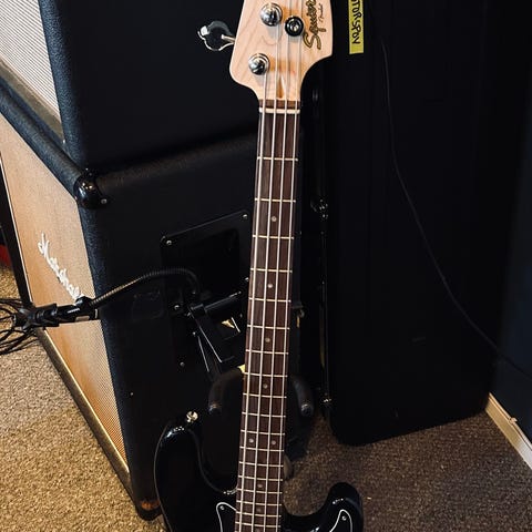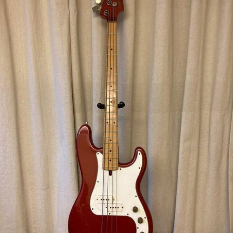 Squier Precision Bass. Byggd 2006 i Cor-Tek-fabriken i Indonesien. Färgen heter Torino Red och har lite ”sparkles” i sig och plektrumskyddet har gulnat snyggt.