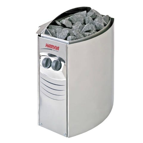 Harvia Saunakiuas elektrisk bastuaggregat med metallkonstruktion och stenar på toppen. Produkten är avsedd för användning i bastu och har skyddsklass IPX4. Det finns monteringsinstruktioner och tekniska specifikationer angivna på enhetens framsida.