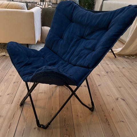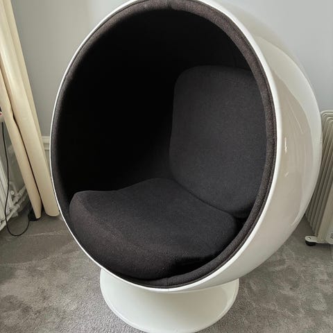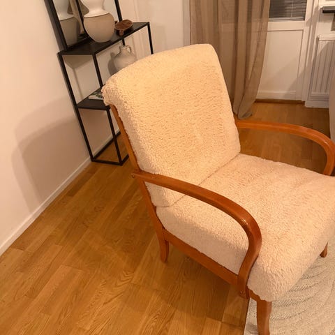 Fåtölj forngiven av Asko Huonekalu, fåtöljens namn är ”Harlekiini” och gjort i Finland på 90-talet. Fåtöljen har en sammetsliknane material i mörkgrå. Köpt på ett auktionshus.
