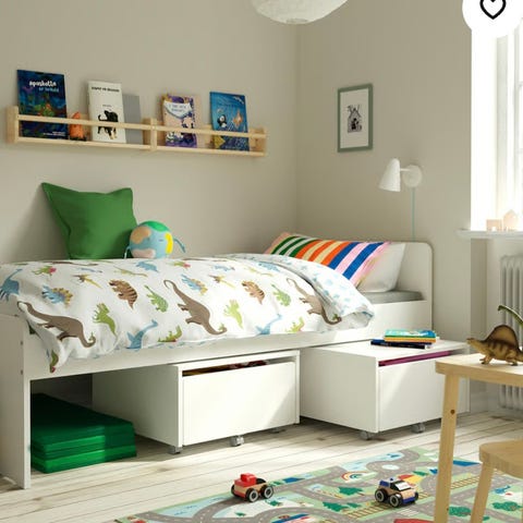 IKEA barnsäng med husformad ram i vitt. Sängen är anpassad för barn och har en design som liknar ett litet hus, vilket kan användas som en del av barnets rumsmiljö. 200x90
