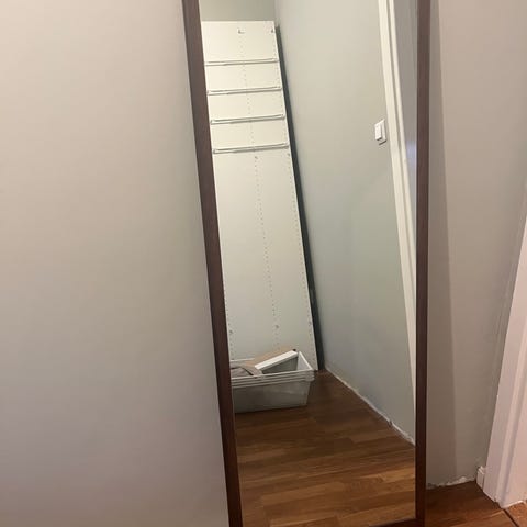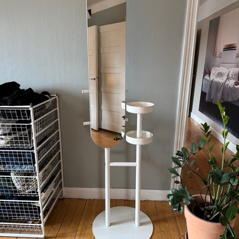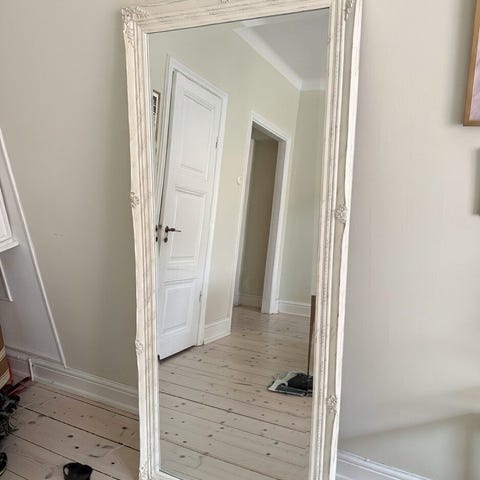 spegel i vit färg med helkroppsdesign. Spegeln är fristående.