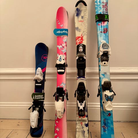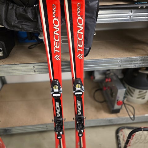 Tecno Pro skidor i röd och svart färg. Skidorna har bindningar monterade och är avsedda för skidåkning. Barn skidor