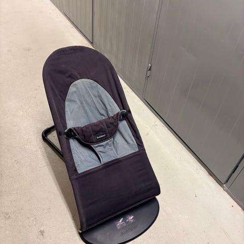 Babybjörn Barnstol barnstol i grått tyg med vadderad sits och säkerhetssele. Designad för små barn med ergonomiskt stöd och lätt att fästa på stol eller användas fristående. Materialet är mjukt och slitstarkt för barnets komfort och säkerhet.