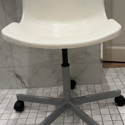 IKEA barnstol i rosa färg med mjukt vadderad sits och ryggstöd. Stolen har hjul för enkel förflyttning och en vit metallram. Passar för barn och kan användas vid skrivbord eller bord för barn.