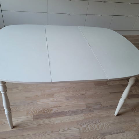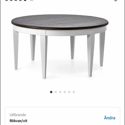 Mios matbord Wilma. Diameter 150 cm. Plats för 6 stolar. 2 iläggsskivor á 50 cm. Ger en längd på 200 cm. Plats för 10 personer. Bordsskiva i jättefint skick. Endast smärre märke på något ben. Att anmärka på är att färgen spruckit vid list på sarg runt om. Se bild. Går att via Mio beställa färg från tillverkaren för täckning. Iläggsskivorna också fint skick. På undersidan finns mindre skrapmärken som uppkommit när de/n spänts fast vid ilägg för förlängning.