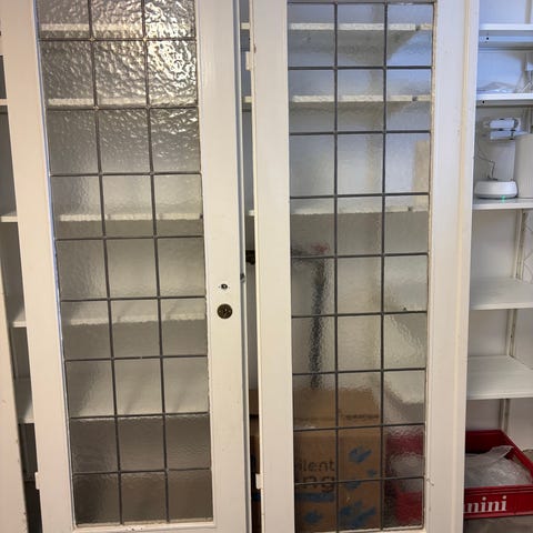Fönsterdörr med två sektioner av färgat glas i olika färger. Dörren är gjord av trä och har en klassisk design med glasrutor i rutmönster. Passar för användning som inner- eller ytterdörr där ljusinsläpp önskas.