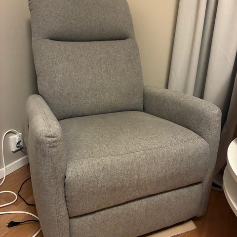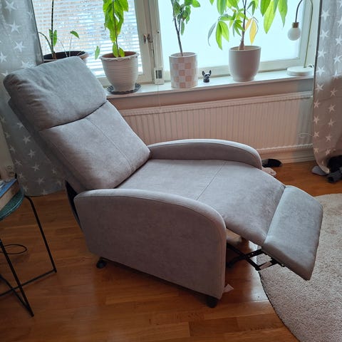 Recliner från Mio i fint skick. Lyftfunktion i sitsen gör fåtöljen lätt att resa sig ur. Med fjärrkontroll kan fåtöljens rygg- och fotstöd ställas i ett avkopplande viloläge.