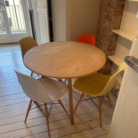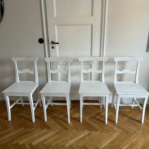 Två vita köksstolar med stoppning säljes. Tyget är helt nytt och oanvänt.