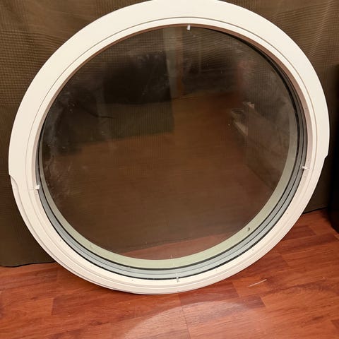 Rund fönsterruta med ram i vitt trä. Passar för installation i väggar eller dörrar där rund form önskas. Materialet är trä och glas. Fönstret är avsett för inomhus- eller utomhusbruk beroende på installation.