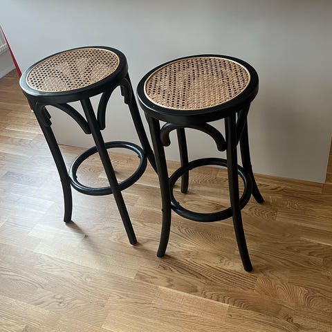 4 st barstolar Ton 14 från märket Ton i färgen Coffee med sits i rotting. Sitthöjd 61 cm. Säljes endast som par eller alla 4 tillsammans. Priset 3 000 kr avser pris/st.
