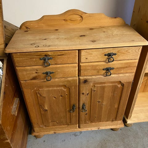 Finns en låda under skivan, en låda att dra ur och ett skåp som kan öppnas.