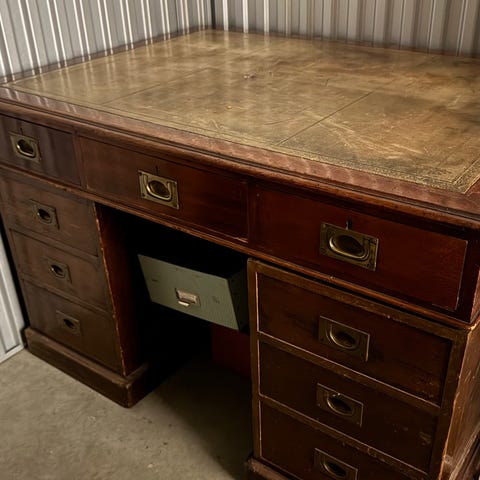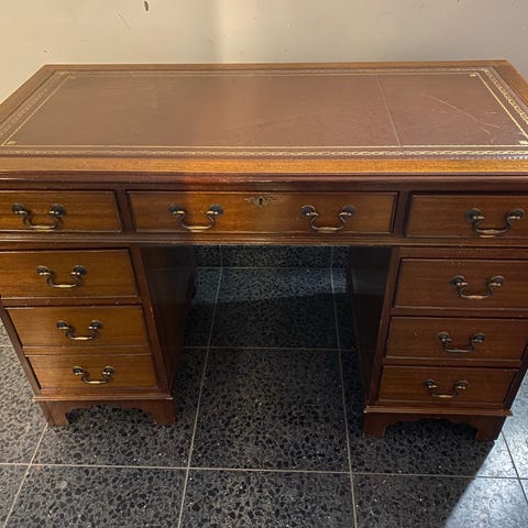 Skrivbord i engelsk stil i mahogny med grönt läder. Tecken på användning finns, se bilder. Alla lådor fungerar som det ska, dock saknas nyckel. 9 lådor. Går att ta isär i 3 delar för enkel frakt