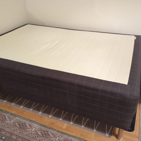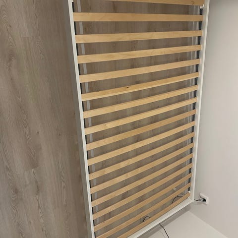 Jysk sängram i svart färg med träribbor som stöd. Ramen är avsedd för att placera madrass på och har ben för stabilitet.