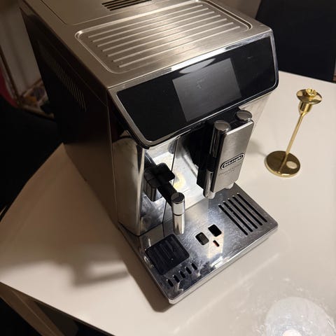 De'Longhi kaffemaskin med mjölkskummare i svart färg. Maskinen är utformad för att brygga kaffe med kapslar och har en integrerad mjölkskummare för att skapa skummad mjölk till olika kaffedrycker.
