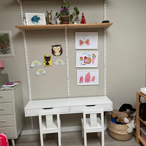 Skrivbord med tre lådor för förvaring och metallben som stöd. Bordsskiva i träliknande material med ljusbrun ton. Passar för arbete eller studier i hemmiljö eller kontor. Bokhylla med 4 hyllplan