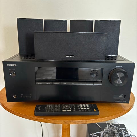 Pioneer högtalarsystem i svart färg. Systemet består av flera högtalare inklusive en subwoofer. Används för ljuduppspelning i hemmiljö.