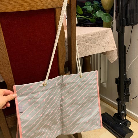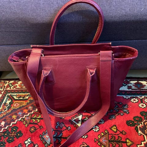 Rymlig och har bärhandtag samt en lång axelrem.