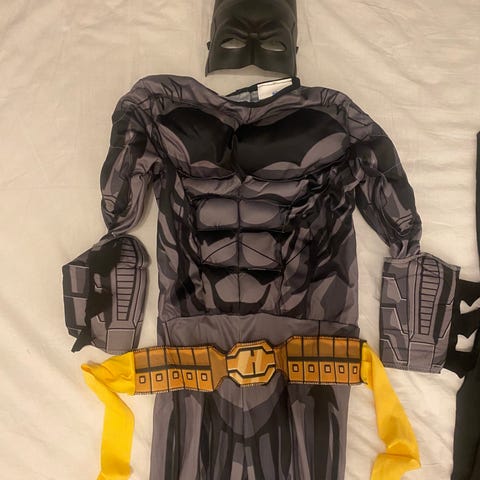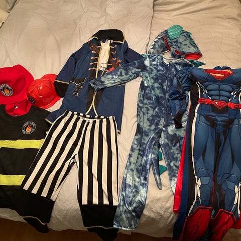 3 dräkter från 4-8 år samt en mask och ett par handskar säljs alla för 400 kronor. Ninjago heldräkt med mask 4-6 år 150 kr, Ninja Turtles storlek 120 utan mask 100 kr och Minecraft Steve överdel och mask 6-8 år för 150 kr samt Star Wars mask 50 kr och ett par handskar 20 kr.