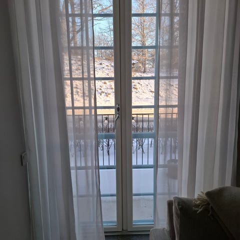 Två par vita gardiner från Hemtex i tunnare väv som ger en känsla av linne.