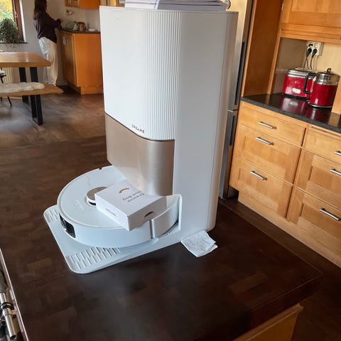 Dreame DreamBot D9 Max robotdammsugare och moppar i färgen vit. Produkten kombinerar dammsugning och moppning för golvrengöring. Den är utformad för att användas i hemmet och kan styras via app för att anpassa rengöringsscheman och områden. Aldrig använd, har bara öppnat förpackningen.