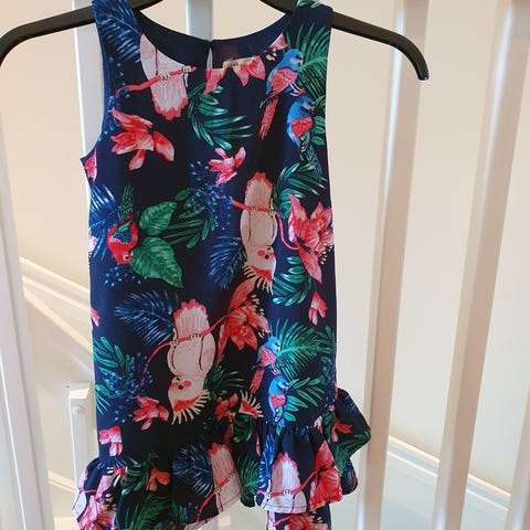 Röd klänning med puffärmar och tryckknappar baktill. 80 % bomull och 20 % polyester.