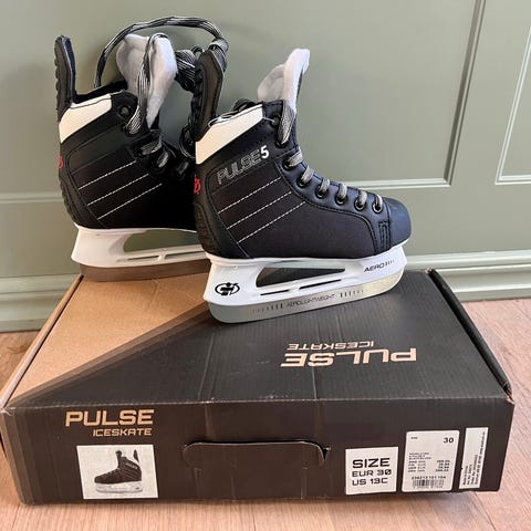Pulse 5 skridskor för barn i storlek 30. Skridskorna är svarta med vita detaljer och är avsedda för ishockey eller allmän åkning.