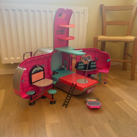L.O.L. Surprise lekset som inkluderar husbil samt 4 stora dockor och 8 små dockor och massor av kläder och tillbehör.