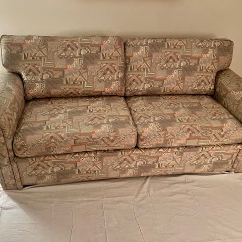 3 sits bäddsoffa från IKEA. Bäddas ut till en dubbelsäng. Förvaringslåda under. Katt har funnits i hemmet. Har en del fläckar (damm och vattenlöslig färg) som kan gå bort med tvätt. Nermonterad i större delar.