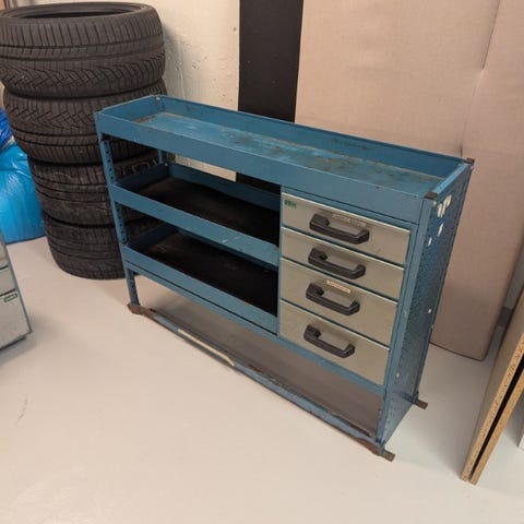 Ett robust metallskåp med en praktisk låda. Perfekt för förvaring i verkstad, garage eller hem. Skåpet har hyllor inuti.