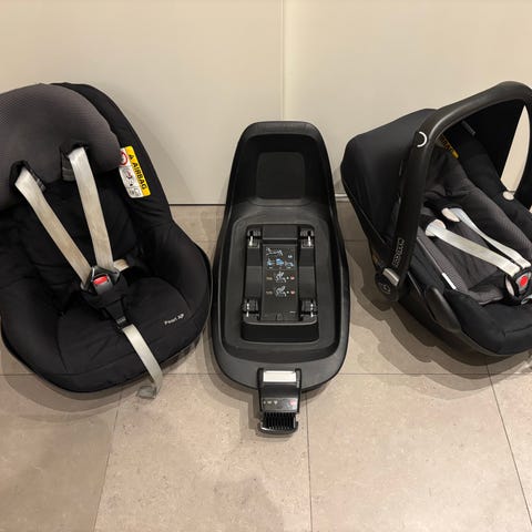 Maxi-Cosi bilbarnstolspaket som inkluderar babyskydd (Pebble Plus), barnstol (Pearl XP) och bas (i-Size kompatibel) som kan användas av barn från nyfödd till 18kg. Paketet är använt av ett barn under 2 säsonger. Kan behöva en tvätt men annars i bra skick. Har inte varit med i någon krock eller annan incident. Kommer från en rök- och djurfri bil.