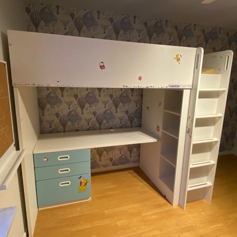 Begagnad IKEA loftsäng i ok skick, lite repor o tecken efter användning. Finns t ex skada på frontskivan utmed sängens långsida men syns inte på första bilden, som är en lånad bild för överblick.