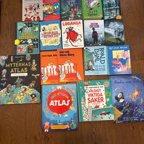 Sonen har rensat ut sina böcker. De flesta är i nyskick, några har han faktiskt läst och de är okej skick. Paketpris kan diskuteras. Vill helst inte skicka.