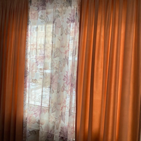 Hemtex gardin tillverkad i linnefärgat tyg. Gardinen är avsedd för att hängas upp i fönster och ger ett naturligt och mjukt ljusinsläpp. Dem är omsydda från 300 cm till 250 cm. Bilderna visar hos mig från tak till golv. Nytvättade. Djur och rökfti hem. Jag har 6 st. 100kr per längd.