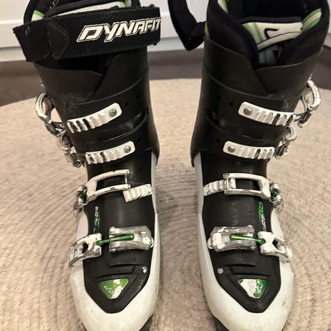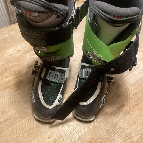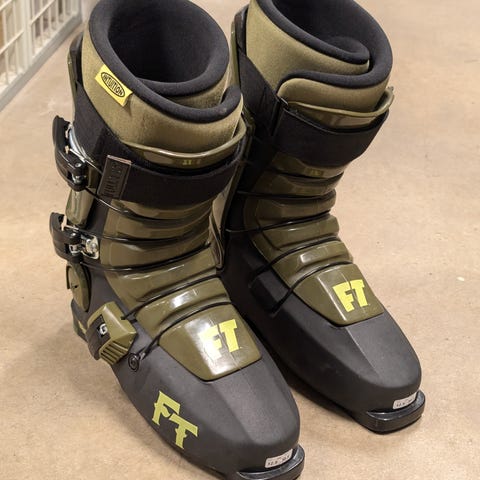 Full Tilt skidpjäxor i färgerna vit, svart och gul. Utrustade med tre spännen och en justerbar kardborrerem för anpassad passform.