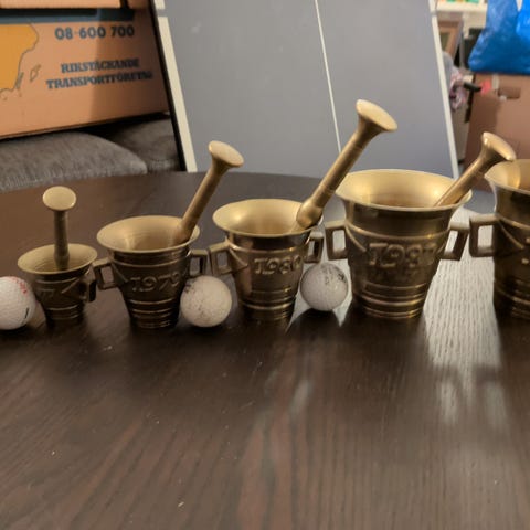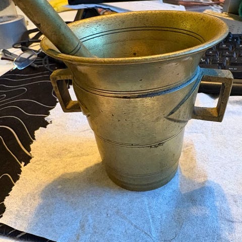 Mortel tillverkad i mässing. Inkluderar mortel och stöt i samma material.