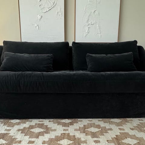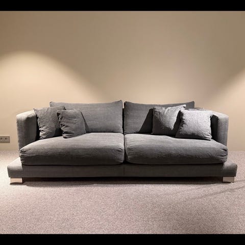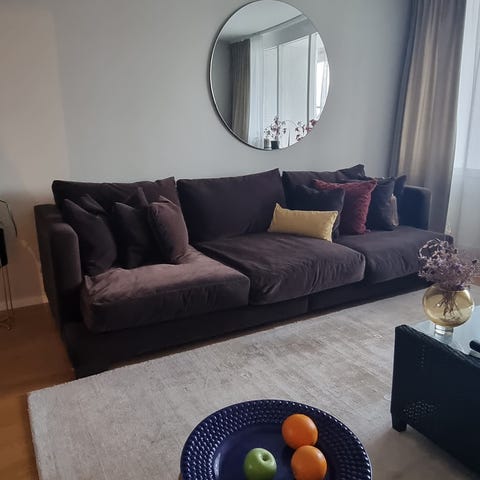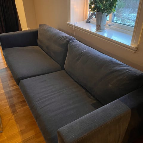 Tyg: Mörkgrå velour/sammet, modellen heter Classic Velvet Anthracite – slitstarkt och tvättbart. Alla kuddar är nytvättade. Soffan kommer från ett djur- och rökfritt hem.