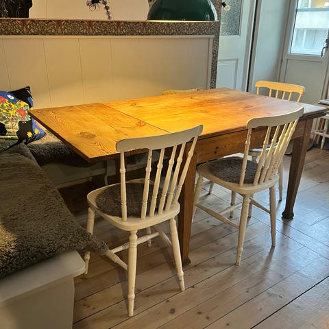 Köksbord, stolar och kökssoffa i allmoge