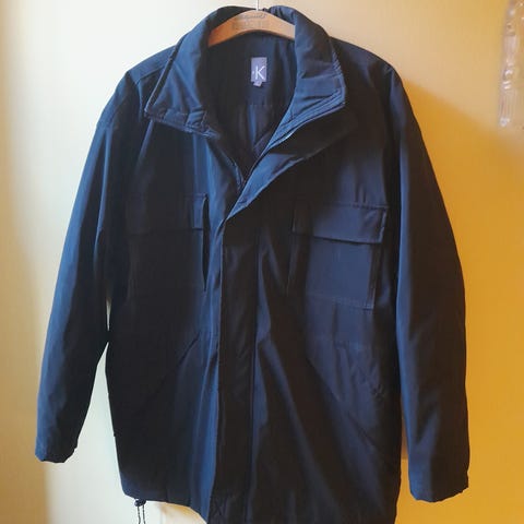 Strl: large, men upplevs stor i storleken (som en XL?), vid i modellen. Fleecefodrad muddar vid ärmslut för att undvika att få in kyla eller snö. Knäpps med dragkedja samt metallknappar. Justerbar luva.