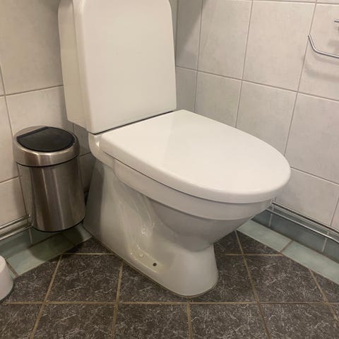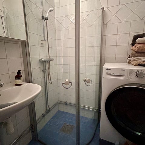 Delar av badrumsinredningen på huvudbilden bortskänkes på grund av renovering.