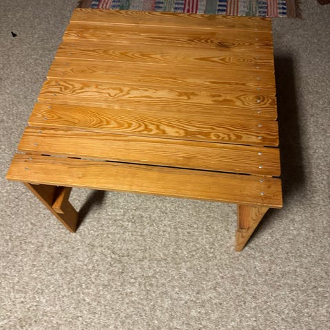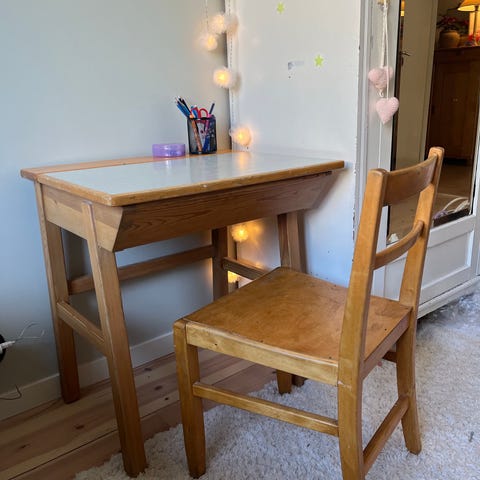 Barnmöbelset bestående av ett bord och två stolar i trä. Troligen Ikea tidigt 90-tal. Bord: H43,5 cm, B45 cm, L60cm. Stol: Sitthöjd24,5cm, djup22,5 cm, bredd28cm, totalhöjd42cm. Endast avhämtning.