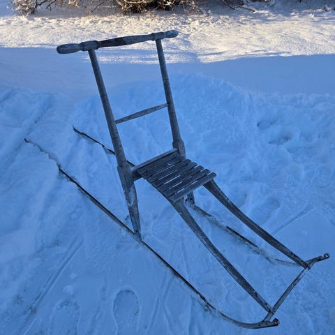 Sparkträda sparkstötting med träram och sits samt medar i metall. Modellen har klassisk utformning med handtag, fotbrädor och långmedar anpassade för åkning på snö och is. Passar för vinterbruk, exempelvis för transporter eller fritidsåkning på plogade vintervägar och isar.