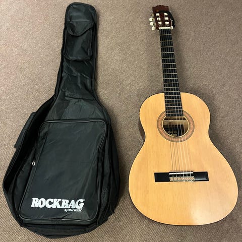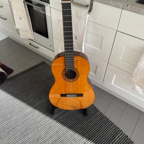 Yamaha CS40 akustisk gitarr. Gitarren har en klassisk design. Mycket bra nybörjargitarr för juniorer eller om man vill ha en lite mindre gitarr. Bra kvalitet. Den levereras med ett mjukt fodral för skydd och transport. Går att bära som ryggsäck.
