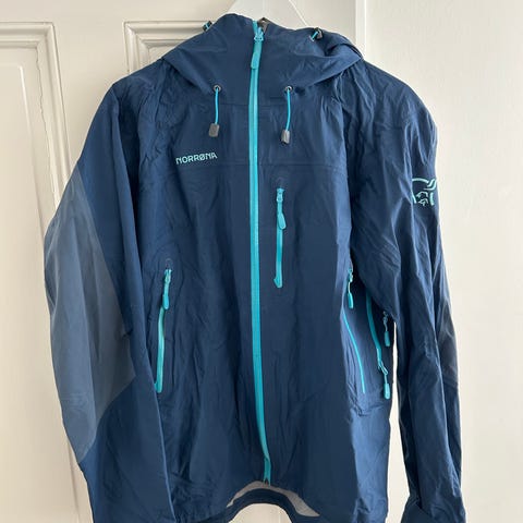 Norrøna Falketind Gore-Tex jacket, junior, i röd-orange och mörkblå färg. Jackan är tillverkad med Gore-Tex material som erbjuder vattentäthet och andningsförmåga. Designad för utomhusbruk med huva och dragkedjor för ventilation och fickor. Storlek 164.
