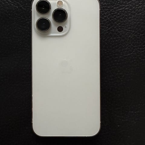 Apple iPhone 12 Pro mobiltelefon med 128 GB lagringsutrymme. Telefonen har en vit färg och rostfri stålram. Batteriets maximala kapacitet är 87 %. Enheten visar vissa tecken på användning, inklusive skador på baksidan. Telefonen är lämplig för användare som söker en iPhone, fungerar perfekt precis som en ny mobil bara synliga skador.