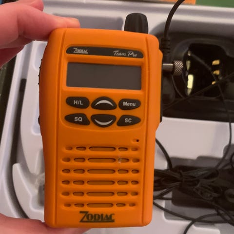 Lafayette Smart Bluetooth radio med tillhörande laddare och förvaringsväska. En bärbar enhet för kommunikation som kan användas i olika miljöer.
