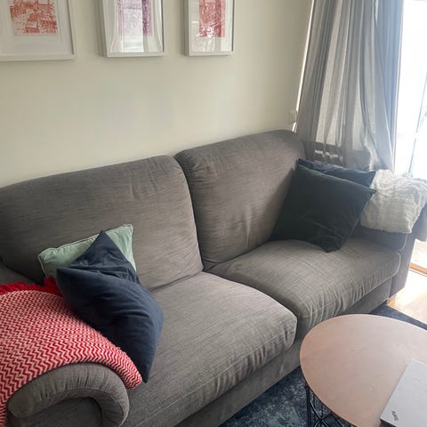 Gratis mot avhämtning. Grått tyg, tvättbart. Hund finns i hemmet. Hämtas i Funbo. Medtag bärhjälp.